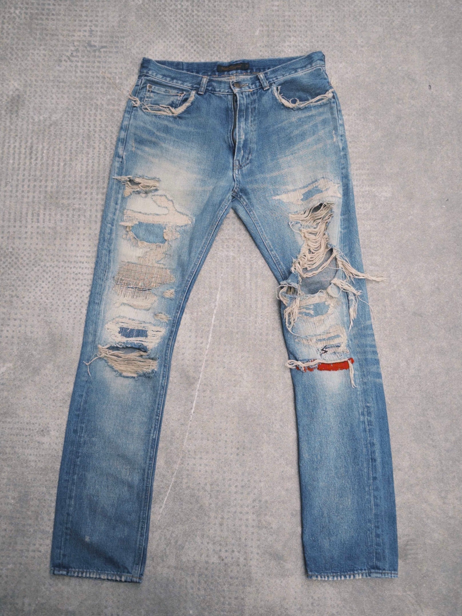 A true archive grail from Jun Takahashi’s pivotal AW04 collection, “But Beautiful” — a season defined by emotional fragility, repair, and rebellion. This pair of Model 68 Red Yarn Denim was constructed entirely from second-hand denim, reworked by hand with traditional Sashiko stitching, and intentionally distressed.